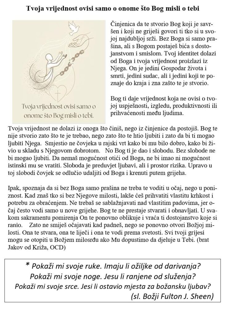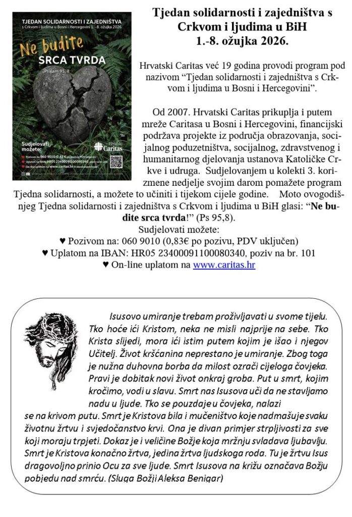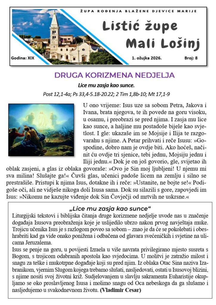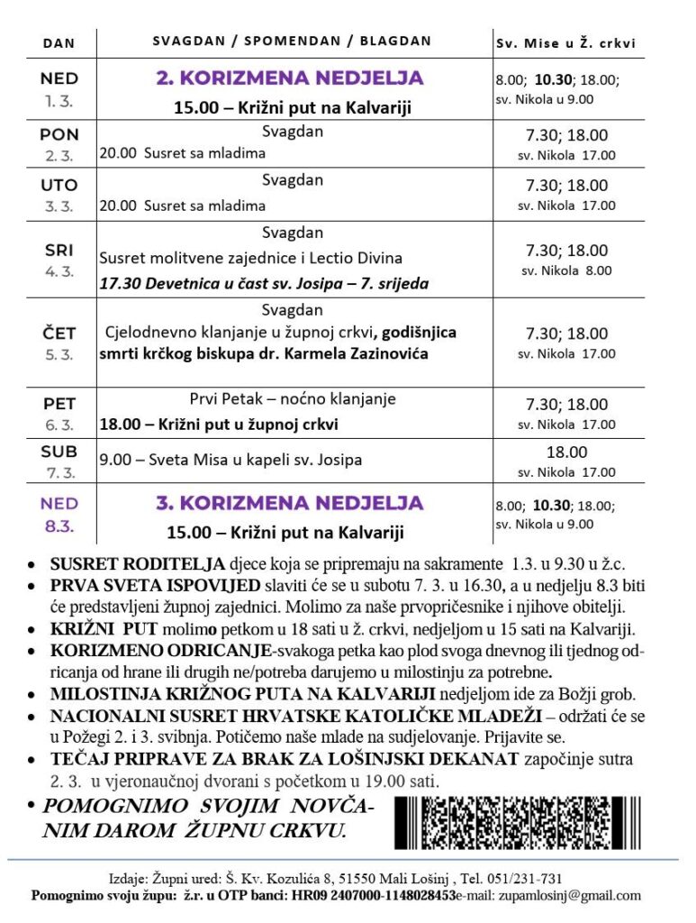 2. Korizmena nedjelja Objava objavljena:01.03.2026 Možda nešto kao NEDJELJA BOŽANSKOG MILOSRĐA 11.04.2026 Uskrs 03.04.2026 3. Korizmena nedjelja 07.03.2026