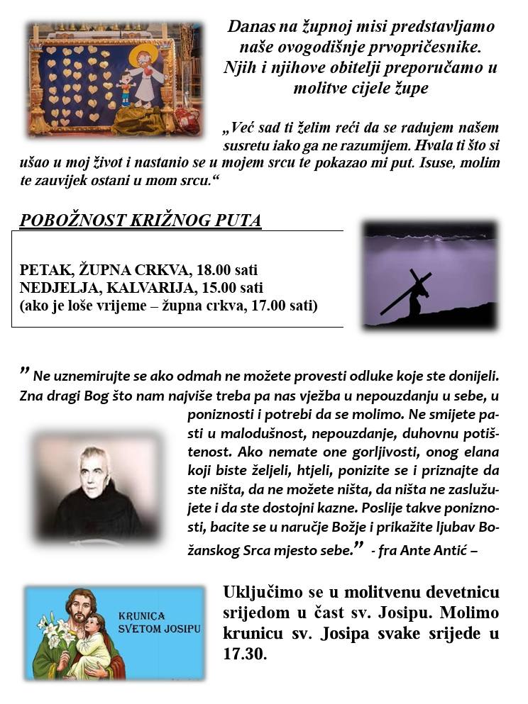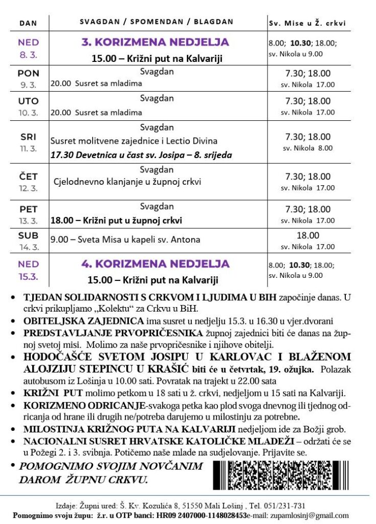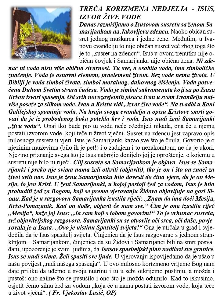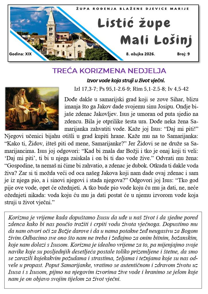 3. Korizmena nedjelja Objava objavljena:07.03.2026 Možda nešto kao NEDJELJA BOŽANSKOG MILOSRĐA 11.04.2026 Maslinska nedjelja 26.03.2026 2. Korizmena nedjelja 01.03.2026