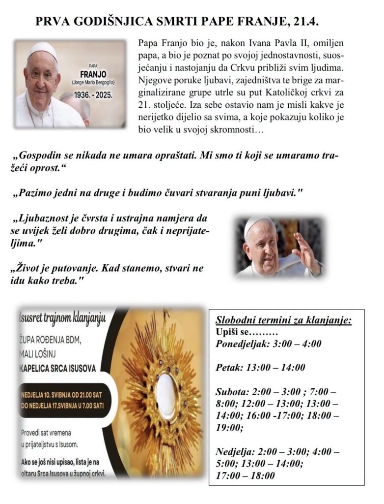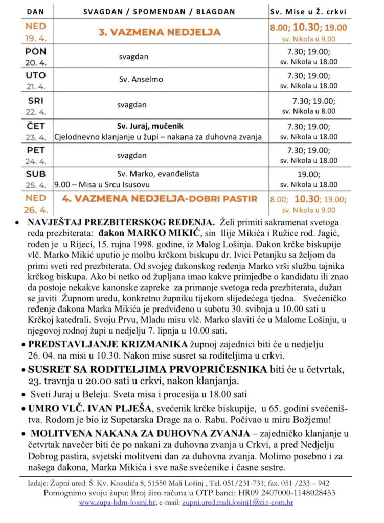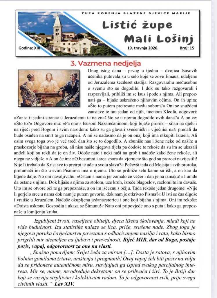 3. Vazmena nedjelja Objava objavljena:20.04.2026 Možda nešto kao Maslinska nedjelja 26.03.2026 Uskrs 03.04.2026 4. Korizmena nedjelja 13.03.2026